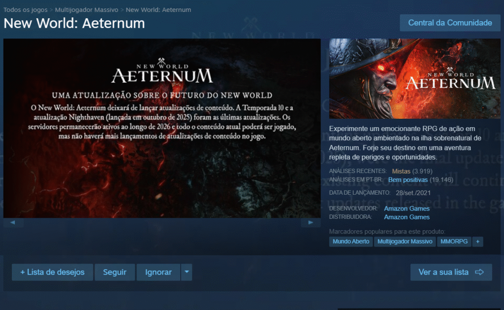 Embora a desenvolvedora diga que New World continuará disponível para compra em todas as plataformas, já não é mais possível adquirir o jogo na Steam.