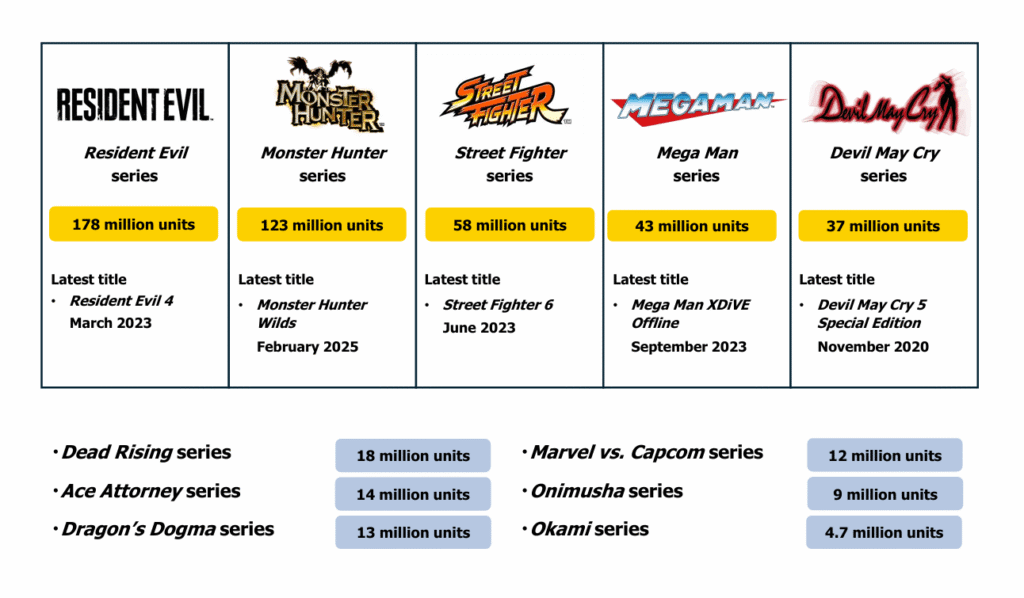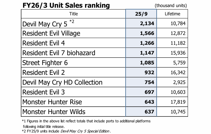 A Capcom ainda atualizou o número total de vendas de algumas franquias. A série Resident Evil chegou a 178 milhões de unidades vendidas, enquanto Monster Hunter atingiu 123 milhões.
